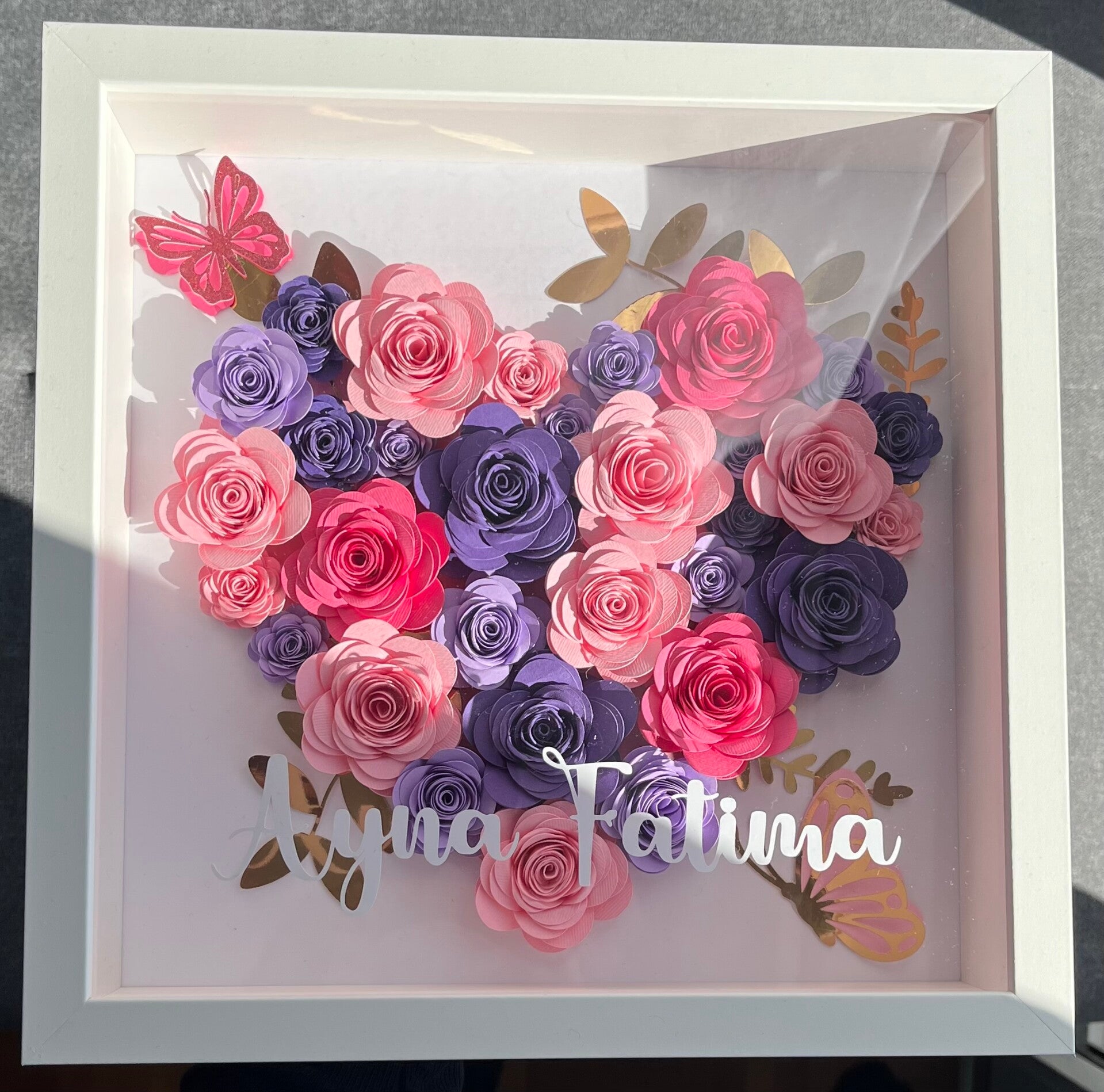 Offrez un cadeau unique et chargé d’émotion avec ce magnifique cadre. Composé de fleurs en papier roulé formant un cœur harmonieux dans des nuances de rose et violet.